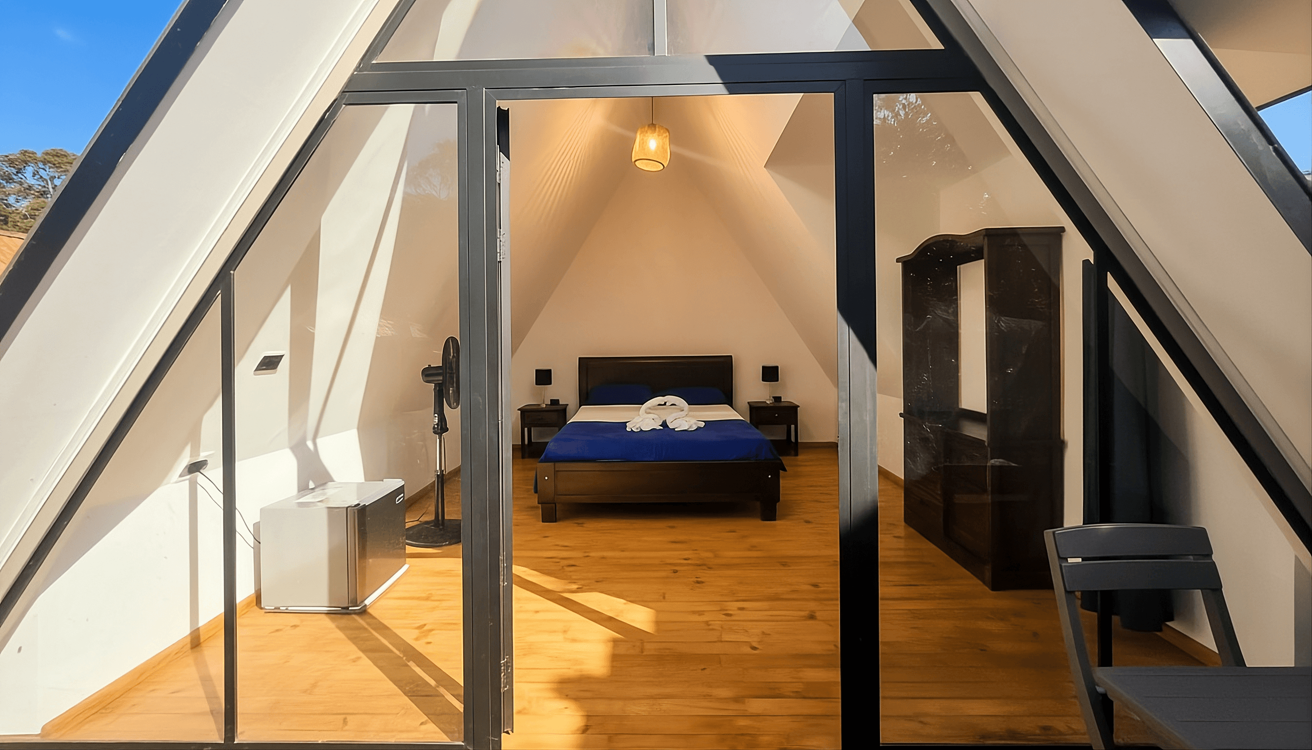 San Gil es la capital de la aventura, pero tu descanso no tiene por qué ser extremo. Glamping Fuego es una cabaña de diseño íntimo pensada exclusivamente para dos personas. Un refugio donde la adrenalina de Santander se apaga para darle paso a una piscina refrescante, zona de fogata, balcon con privacidad absoluta y el confort de un hotel boutique, pero en medio de la naturaleza. Aquí vienes a desconectar del mundo y a reconectar con tu pareja.